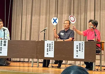 赤磐商工会20周年事業で片岡総社市長とパネルディスカッションを行いました。春風亭昇吉師匠の司会で楽しく皆さまに喜ばれました。