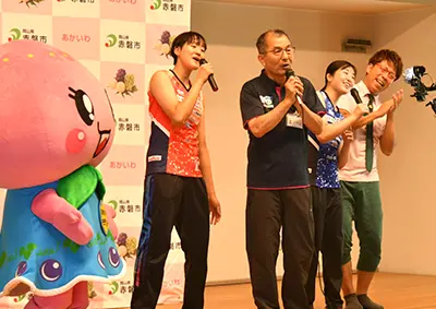 BSよしもと「市町村長うた自慢まち自慢」にシーガルズ選手と出演しました。市のPRと赤磐市の歌を歌って楽しくかつ熱烈にPRをしました。